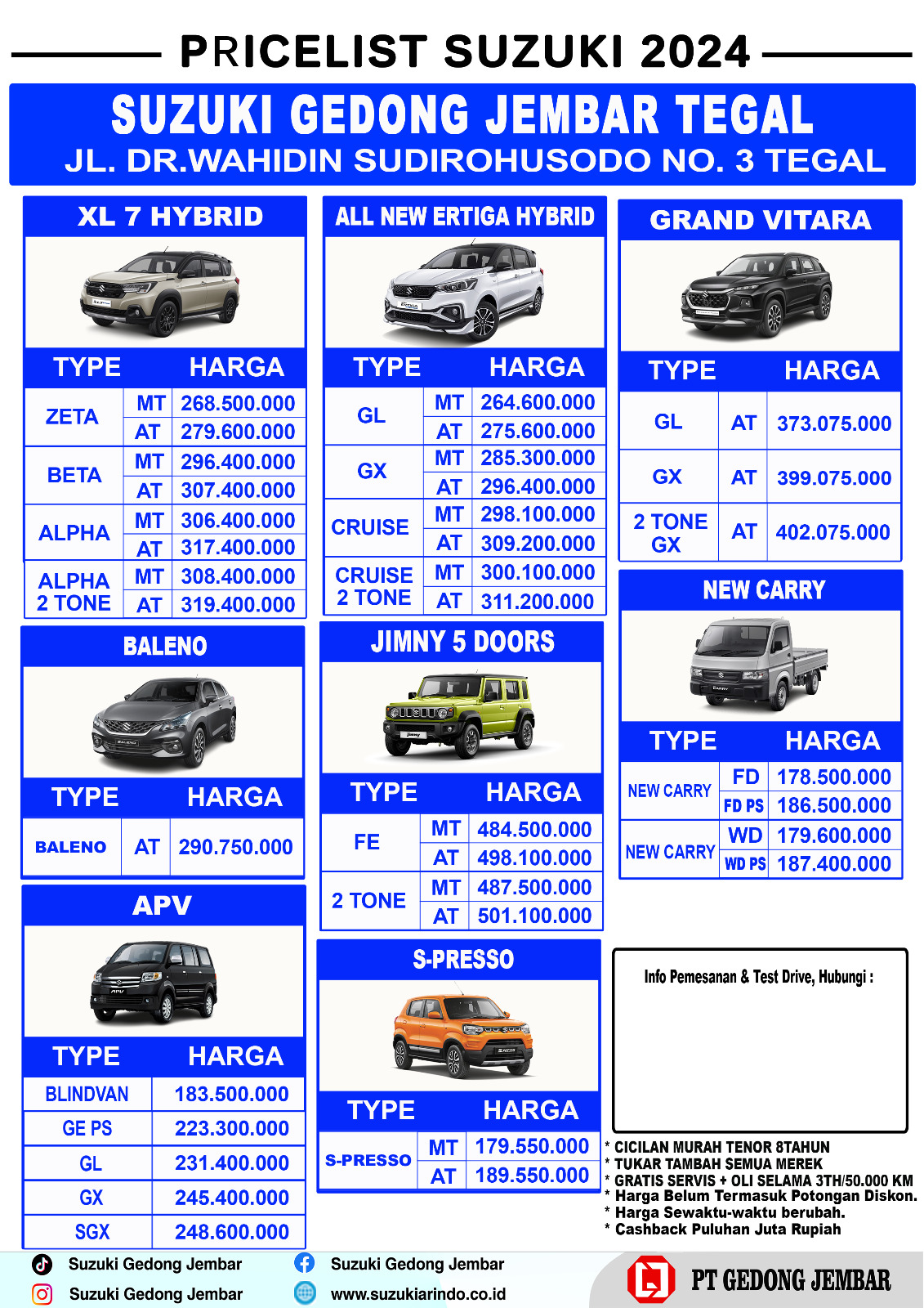 Berikut adalah pricelist harga mobil Suzuki yang tersedia di dealer kami untuk bulan November 2024. Kami juga menawarkan berbagai promo menarik untuk mempermudah Anda memiliki mobil impian. Mari kita lihat daftar harga mobil Suzuki Tegal terbaru: